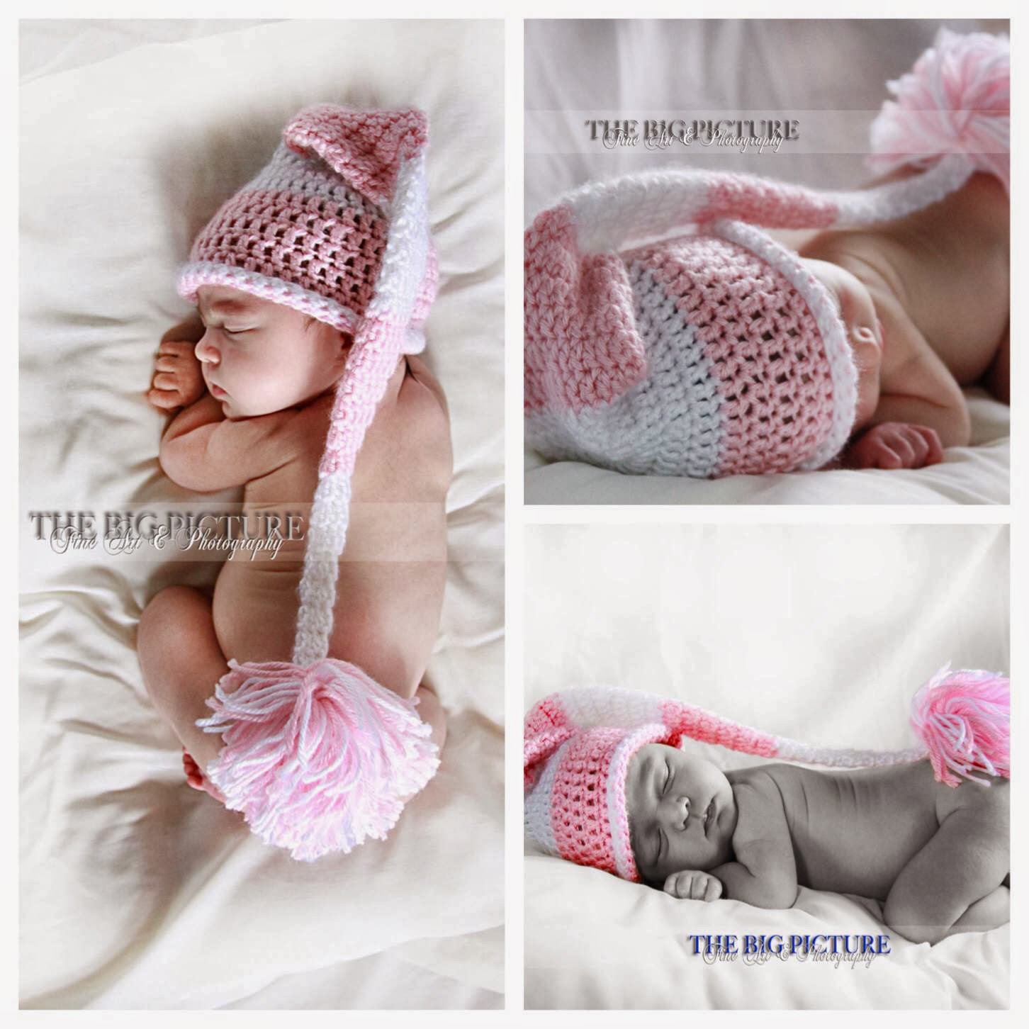 Crochet Newborn Infant Striped long tail elf hat with Supersize pompom